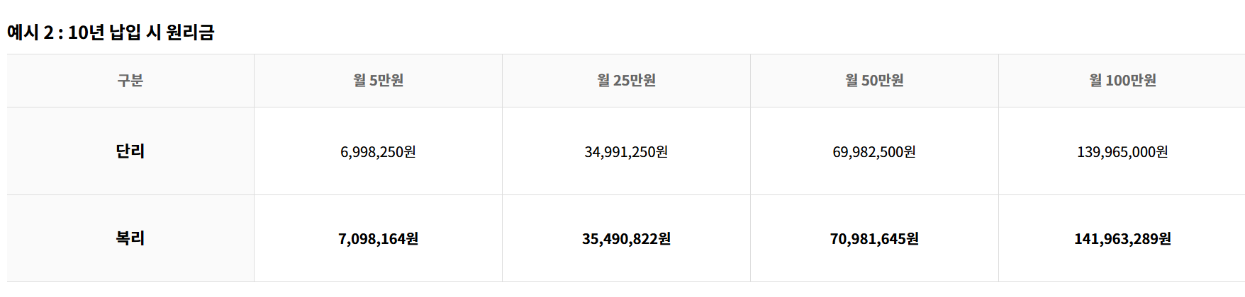 또한 복리 이자는 납입기간이 늘어날수록 받을 수 있는 원리금 차이가 커집니다.