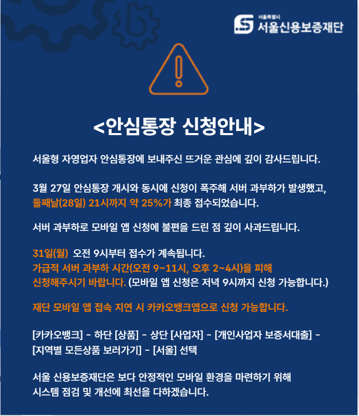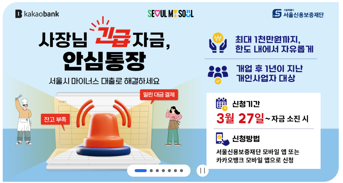 최근 경제 상황이 어려워지면서 자금 조달에 어려움을 겪고 있는 소상공인들을 위해 서울시가 마이너스 통장 방식의 '서울시 안심통장'을 출시하였습니다. 3월 27일 개시와 동시에 신청이 폭주해 해당 홈페이지 서버가 다운될 만큼 많은 관심으로, 지원이 조기종료될 것으로 보이니, 4.84%의 낮은 금리로 안심통장을 이용하고자 하시는 자영업자 분들은 서둘러 신청하시길 바랍니다.