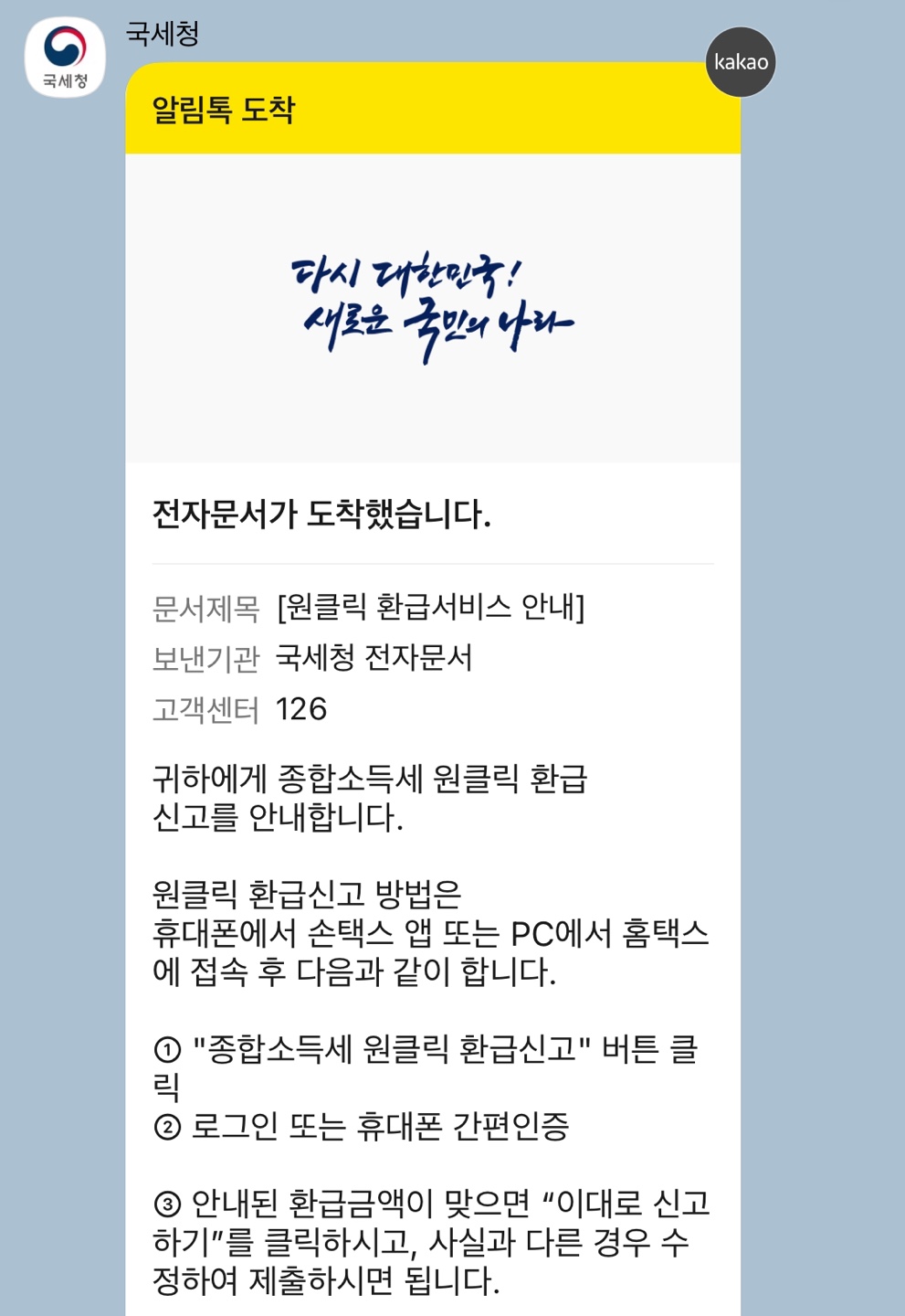현재 환급 대상자에게는 핸드폰 알림톡으로 개별 안내하고 있으며, 국세청 인증 마크가 있는 안내문을 받은 납세자는 스미싱 걱정 없이 홈택스에 접속해서 안심하고 신청하면 됩니다.
