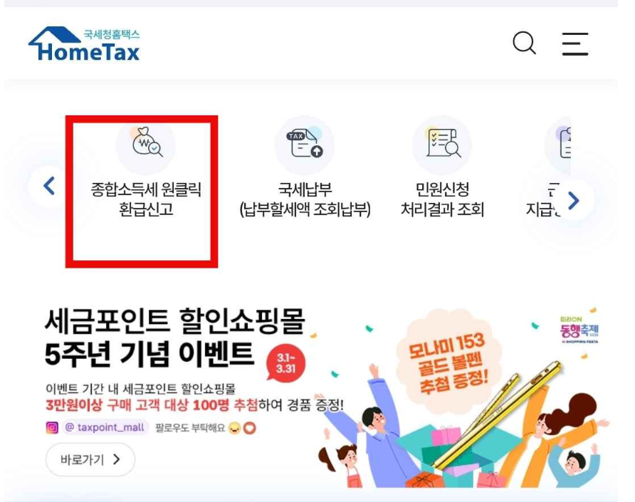 홈택스 첫 화면에서 '원클릭 환급 신고' 버튼을 클릭하고 간편인증 등으로 로그인하면 환급금액을 안내받을 수 있습니다.