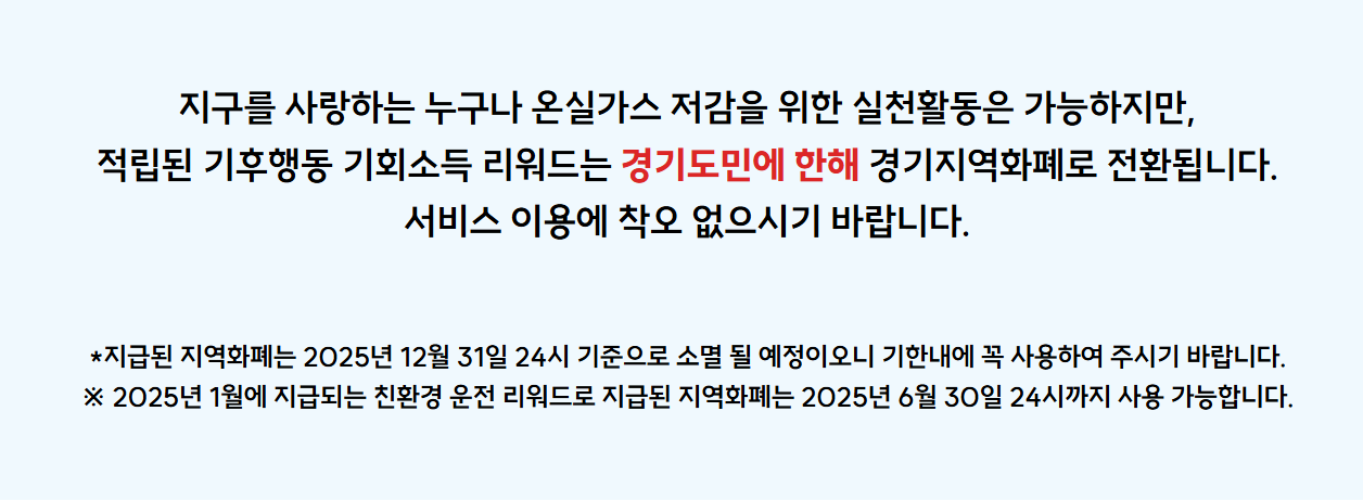 각 활동에 참여하면 일정 포인트가 적립되며, 누적된 포인트는 지역화폐로 전환되어 2025년 기준 연간 최대 6만 원까지 지급됩니다. ( 2024년에는 3만원까지 지급) 적립된 리워드는 매월 지역화폐로 전환되어 현금처럼 사용할 수 있으며, 향후 교통카드에 충전하여 사용할 수 있는 기능도 추가될 예정입니다.