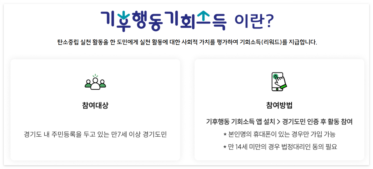 경기도는 기후위기 대응과 탄소중립 실현을 위한 정책으로 '기후행동 기회소득'을 시행하고 있습니다. 이 정책은 도민들이 일상생활에서 온실가스 감축할 수 있는 활동을 실천하면 그에 따른 보상을 제공하는 제도인데, 참여 가능한 활동이 다양하고, 그 중 2-3개 정도는 현재도 누구나 실천하고 있는 내용들이 많아, 경기도민이라면 누구든지 쉽게 혜택을 받으실 수 있습니다. 2024년 7월 애플리케이션 출시 이후, 불과 5일 만에 가입자 수가 5만 명을 돌파하였으며, 2025년 2월에는 누적 가입자 수가 100만 명을 넘어섰습니다. 지구도 살리고, 리워드도 받을 수 있는 이 기회를 놓치지 마세요! 그럼 바로 참여방법을 자세히 알아보도록 하겠습니다.