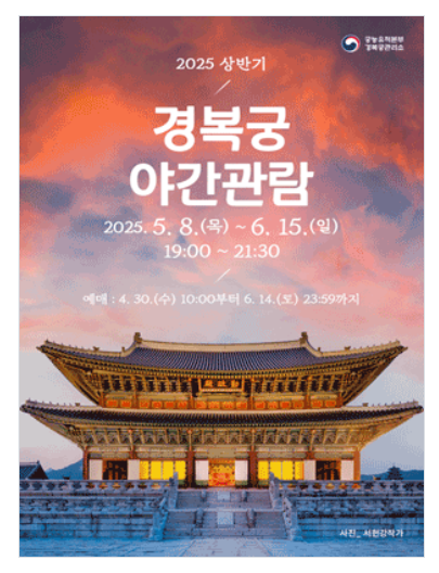 지금이 아니면 또 1년을 기다려야 하는 경복궁 야간개장! 정말 아름답기로 유명한 경복궁 야간개장 기간을 놓치지 마시고 티켓이 남아있는 날짜가 있는지 바로 조회해보세요.